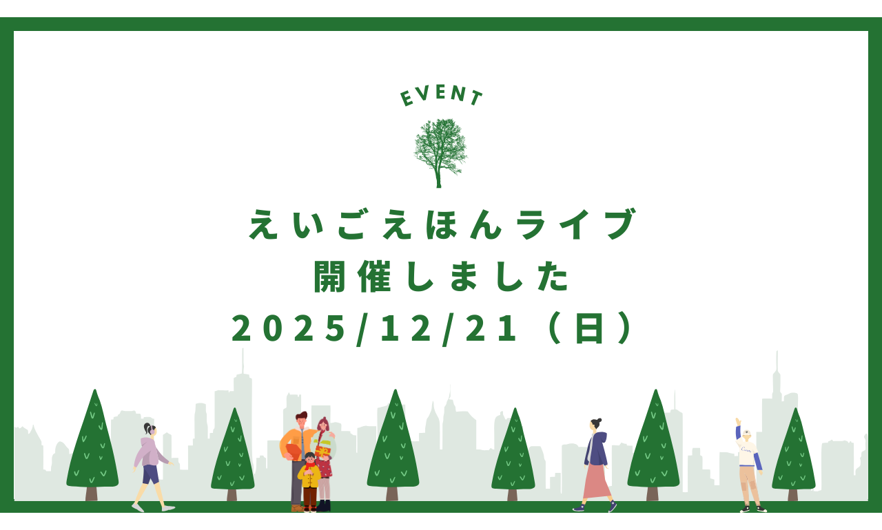 Blog 2026/2/22(日)第10回えいごえほんライブ開催決定! The 10th Event! 2026/1/25(日)第9回えいごえほんライブ開催しました! The 9th Event! 2026/1/25(日)第9回えいごえほんライブ開催決定!The 9th Event! 2025/12/21(日)第8回えいごえほんライブ開催しました!The 8th Event! 2025/12/21(日)第8回えいごえほんライブ開催決定!The 8th Event! 2025/11/8(土)第7回えいごえほんライブ!北図書館フェスタに参加しました!Kita Library Festival! English Forestこれまでの活動報告!2024-2025年 2025/11/8(土)第7回えいごえほんライブ開催決定!The 7th Event! 2025/9/7(日)第6回えいごえほんライブ開催しました!The 6th Event! 2025/9/7(日)第6回えいごえほんライブ開催決定!The 6th Event!
